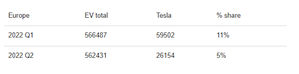 伴隨著市場占比的下降,特斯拉第二季在歐洲的銷量也不理想,總共賣出 26154 輛,相比第一季 59502 輛的銷量,特斯拉第二季在歐洲的銷量「直接砍半」,下滑程度高達 56%。而看衰特斯拉的歐洲媒體對此評論,好在特斯拉德國工廠即時於 2022 年 3 月 22 日正式投產,如果沒有在德國建立工廠,特斯拉在歐洲市場的表現還可能更糟。