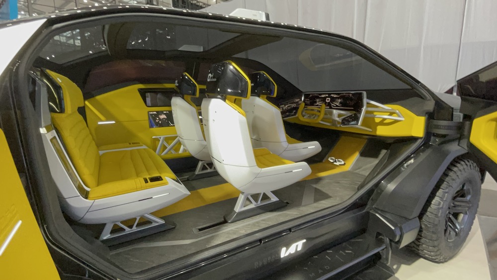 而映入眼簾的內裝風格,在當今車壇上幾乎從未見到過!TRUCK-MAD 內部設計以「沈浸式星艦造型」為出發點,因此從前方駕駛座的儀表板、中控觸控螢幕,至左側車身,乃至於後照鏡,全都配置有高畫質螢幕,提供乘客所需要的訊息及視聽娛樂享受。