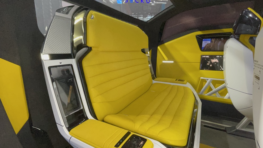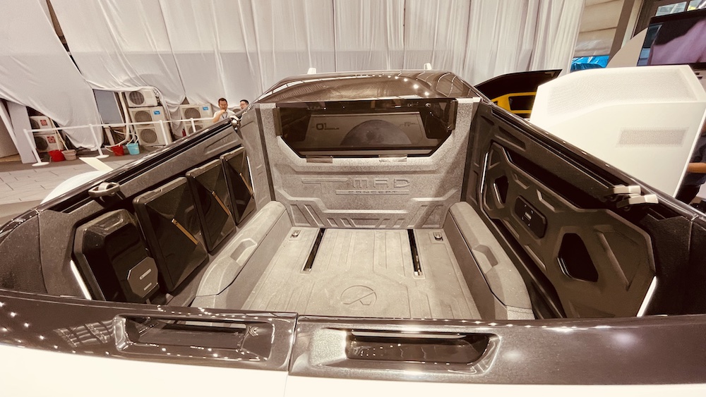 TRUCK-MAD 的座位配置也很跳 Tone,是 1+2+2。當今汽車內艙的座椅變化,頂多是將座位躺平,增加車室內的開放空間,但 TRUCK-MAD 可能會改變你對車子的「三觀」。它的內部可根據需求,變化出駕駛/暢享/商務/敞篷等四種模式,最特別的設計是第三排座椅後方的檔隔板一推開,末排座椅竟然可以滑移至後車斗,配合上可升降的車頂,儼然形成敞篷車的效果。