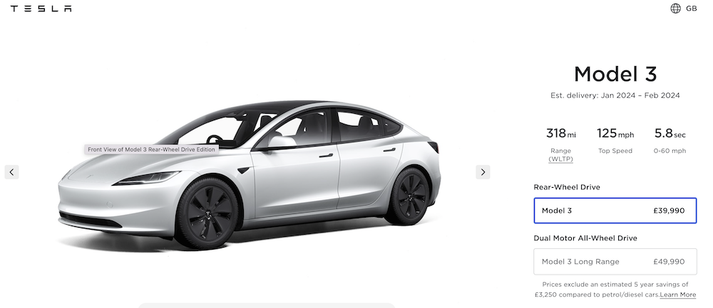 Model 3 Highland 在英國的售價(來源/Tesla UK)