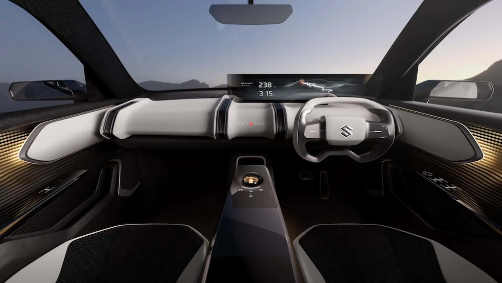 SUZUKI eVX 的實體車,於 2023 年 1 月在印度舉辦的「Auto Expo 2023」中首次公開亮相,但當時只看得到「外觀」,而其「內裝設計」則是在東京車展首次曝光;加上完善的電子控制、四輪驅動技術,SUZUKI 很自信地表示,他們打造出一款真正符合 SUV 特質、又擁有優異駕駛性能的 EV 車款。